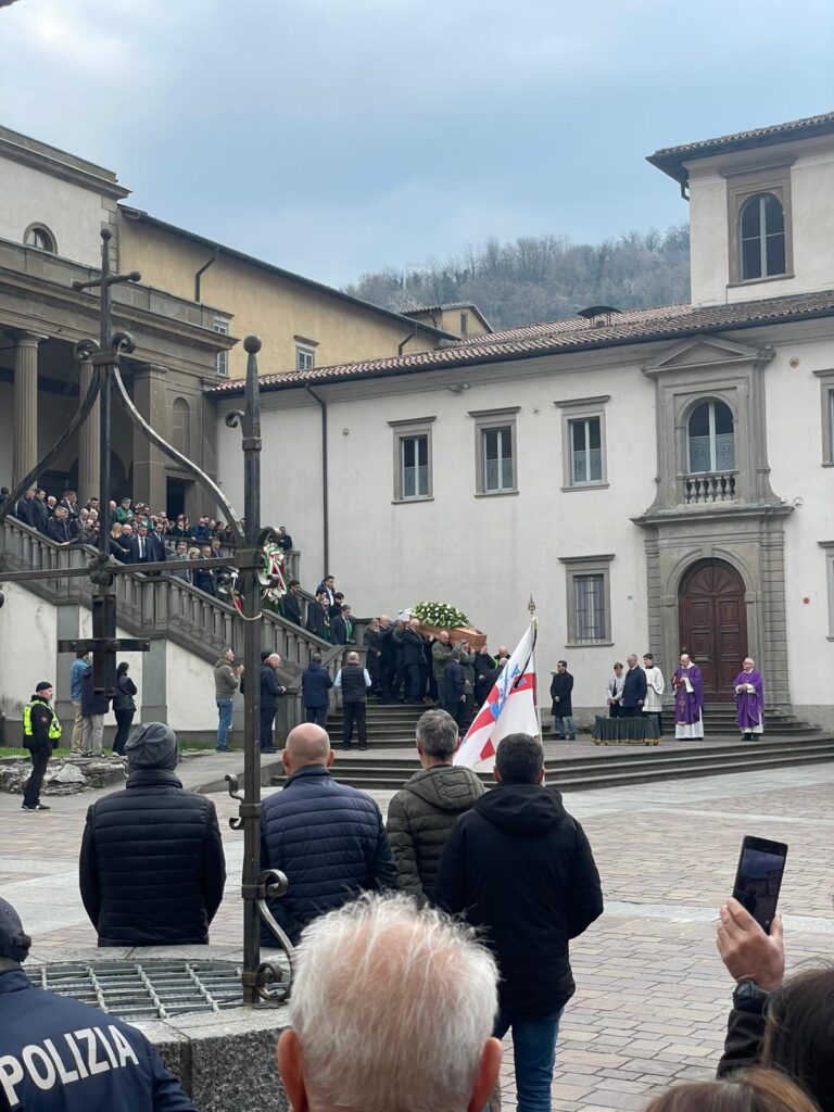 All’uscita del feretro, coperto da una bandiera padana, il rumorìo si intensifica: partono vecchi cori che la militanza non ha mai dimenticato.