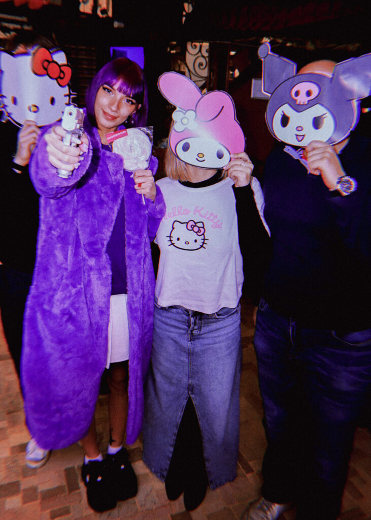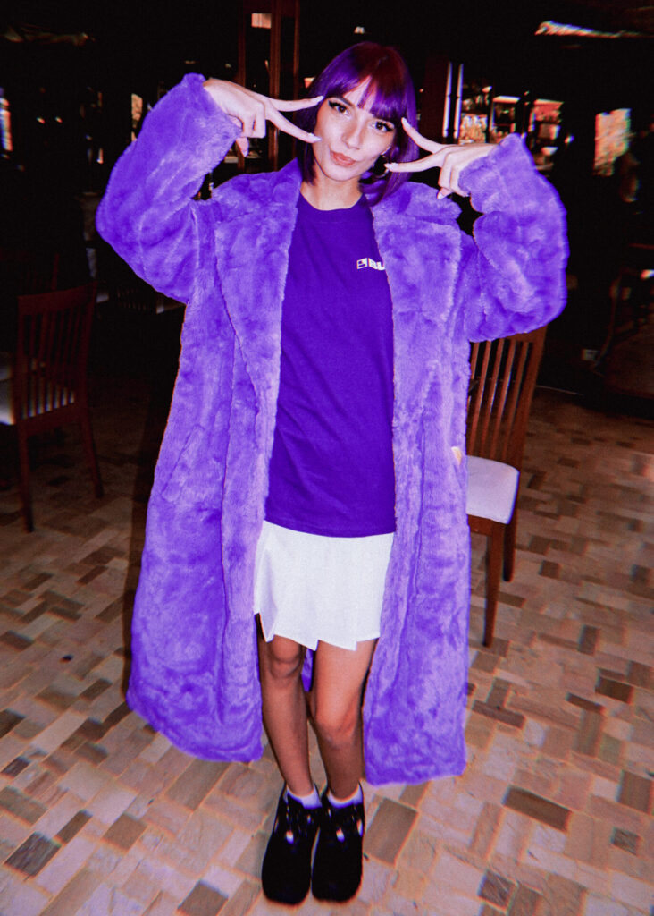 Imbandiamo la tavola, ma manca la bandiera dei pirati. Arriva Ranpo , si scusa e si presenta con i nostri ospiti arrivati prima dei padroni di casa. Posa la bandiera, ci buttiamo caramelle sopra, oltre che una lattina di bibita cancerogena con la grafica di Jigglypuff. Plachiamo i convenevoli, facciamo sedere Lei, la ragazza con la pelliccia viola. È l’astro dell’hyperpop italiano del momento, è forse una idol in terra di cantautori.