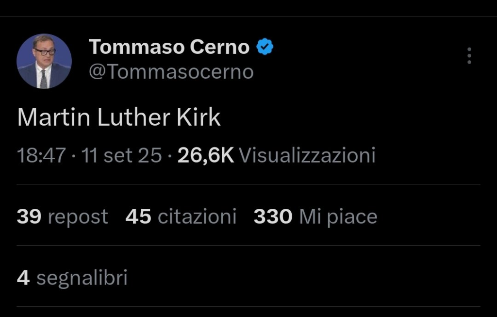 Ovviamente, chiariamolo: questo è un cope bello e buono. Kirk era, è rimasto, e sarebbe rimasto fino alla fine un convinto evangelico di destra, con tutto il corollario teologico-politico che questo comporta. Le sue presunte “critiche a Israele”, più figlie di un taglia e cuci che di una evoluzione organica, non sono mai state una rottura con niente; erano, nel migliore dei casi, le stesse identiche osservazioni che fa anche il più moderato esponente di centrodestra quando deve prendere le distanze dai massacri più evidenti per non perdere la faccia.